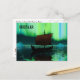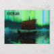 Uma imagem ligeiramente estilizada de um navio de longa distância Viking navegando à noite sob as Luzes do Norte ali um casal de icebergs; a maioria da tripulação está dormindo. A leitura de texto "VIKINGAR" (Vikings) também é exibida.