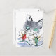 Piscando, Piscando... O gatinho da cinza está muito intrigado com as luzes de Natal vermelhas e verdes piscando para a árvore de férias. Sumi-e, pintura de tinta japonesa a cores. Artista Ellen Miffitt @ Nine Lives Studio