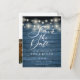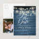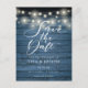 Este cartão de salvação da data rústica apresenta lindas luzes de corda e uma elegante escrita salve a data acima dos seus detalhes definidos em tipografia elegante em um fundo de painéis de madeira azul rústico. O verso apresenta sua foto especial e tem detalhes adicionais de salvação da data, incluindo o código QR do site do seu casamento, com seu endereço de retorno e espaço para o endereço do destinatário. Projetado por Thisisnotme©