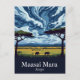 A moody, retro-style travel poster illustration of the Maasai Mara National Reserve in Kenya. The image captures a dramatic twilight or storm atmosphere with a dark, swirling, cloud-filled sky in deep blue and white. Silhouetted acacia trees frame a vast golden-green savanna where two African elephants graze. The title "Maasai Mara" and "Kenya" are displayed in white and gold on a solid dark blue background.