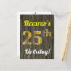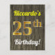 Este simples e personalizado design de cartão postal temático de aniversário apresenta uma mensagem personalizável como "25º Aniversário de Riccardo!" na frente, onde o nome pode ser alterado, e com o "25º" tendo uma aparência semelhante a ouro. A frente também apresenta um fundo com aparência de madeira falsa. O verso apresenta uma mensagem personalizável e um endereço do destinatário personalizado. A mensagem e/ou o endereço do destinatário podem ser deixados em branco se forem ser preenchidos à mão. Poderia ser enviado como uma saudação a alguém que está celebrando seu vigésimo quinto aniversário, ou talvez cartões postais como esses possam ser usados como convites ao convidar convidados para uma festa realizada para celebrar o vigésimo quinto aniversário de alguém.