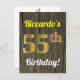 Este simples e personalizado design de cartão postal temático de aniversário apresenta uma mensagem personalizável como "55º Aniversário de Riccardo!" na frente, onde o nome pode ser alterado, e com o "55º" tendo uma aparência semelhante a ouro. A frente também apresenta um fundo com aparência de madeira falsa. O verso apresenta uma mensagem personalizável e um endereço do destinatário personalizável. A mensagem e/ou o endereço do destinatário podem ser deixados em branco se forem para ser preenchidos à mão. Ele pode ser enviado como uma saudação para alguém que está celebrando seu aniversário de cinquenta e cinco anos, ou talvez cartões postais como esses possam ser usados como convites ao convidar convidados para uma festa realizada para celebrar o aniversário de cinquenta e cinco anos de alguém.