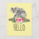 Um cartão postal de saudação com uma adorável design de aquarela. Mãe e bebê do urso Koala. O bebê está andando nas costas da mamãe. Em pé em um galho de árvore. Um buquê de flores de hibisco debaixo deles. Fundo amarelo de banana.
