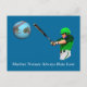 Uma batedeira feminina, representando a Mãe Natureza, atinge um globo de baseball da Terra. O texto "Mãe Natureza Sempre Morde Por Último" também é exibido. Provocar mudanças no ambiente pode ter consequências inesperadas e indesejadas. Escolha a sua própria cor de fundo.