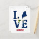 Maine State Love. Principal em letra vermelho brilhante maiúscula. A palavra amor está preenchida com a bandeira estadual e a letra O apaixonada é moldada na silhueta do estado de Maine.