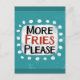"Mais Fries, por favor" é um design de texto divertido com uma forma de sotaque branca cercado por pontos brancos texturizados.