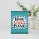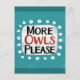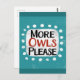 "Mais corujas por favor" é um design de texto bonito em azul com texto preto e vermelho, junto com uma forma de sotaque branca e pontos brancos texturizados ao seu redor.