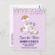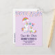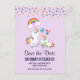 Salve o cartão-postal com um unicórnio branco com rico colorido e principal. Um unicórnio bebê deitado ao seu lado, com um pacificador verde na boca. Um arco-íris colorido com nuvens lisas, e algumas estrelas e corações decoram este doce e adorável design. Um contorno cor-de-rosa em negrito ao redor da imagem lhe dá uma vibração de rabisco em forma de criança. Fundo roxo claro. Pontos de Confetti ao longo do topo.