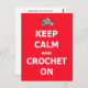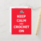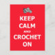 Cartaz de "Mantenha a calma e o crochê aceso", em vermelho e decorado com uma pele preta e branca de lã e dois ganchos vermelhos de crochê.