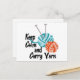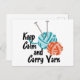 Duas bolas de fio e agulhas de tricô com "Manter a calma e o fio carregar"