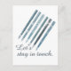 Mantenha-se em contato com este cartão-postal ilustrado das canetas de fonte azul-vintage. O modelo personalizado diz, "Vamos fica em contato."