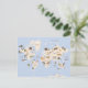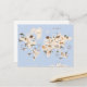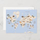 Mapa mundial com animais postais. Possui todos os 7 continentes em um oceano azul pastel macio.