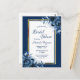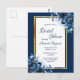 Na frente: um fundo azul marinho com um quadro fino de ouro simples e branco. Decorado com flores azuis, rosas. Modelos para a noiva ser o nome e os detalhes da festa. O nome e o texto: Chá de panela são escritos com um script de estilo manuscrito, letras azuis coloridas. Voltar: Sem cor de fundo. Dica: Se você não quiser que pareça um cartão postal, clique em personalizar, vá para o verso e remova o divisor e o carimbo de posto. Este cartão também está disponível em nossa loja com um fundo azul marinho no verso.