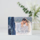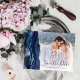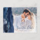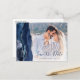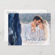 Esta elegante horizontal salvando a data do cartão-postal apresenta uma marinho azul-d-água com borda agitada com falso brilho prateado. Substitua facilmente a imagem de exemplo por sua própria foto da futura noiva e noiva. O texto personalizável combina o script de escrita manual azul escuro de marinho e a fonte de impressão; um filtro de gradiente branco ajuda a tornar o texto pop. Adicione seu endereço de devolução e detalhes adicionais ao lado inverso.