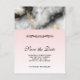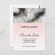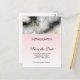 Casamento guarde o cartão postal com um padrão elegante e moderno marmoreado. Cinzas brancas, pretas e enfumaçados marmoreadas com fitas finas de espirais douradas ao longo do padrão. Um fundo gradiente de rosa claro debaixo do padrão marmoreado.