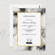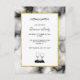 Um convite de janto postal com um padrão elegante e moderno marmoreado. Cinzas brancas, pretas e enfumaçados marmoreadas com fitas finas de espirais douradas ao longo do padrão. Um quadro retangular em camadas acima com o dentro de texto. Os design incluem um par de óculos de vinho preto e um divisor decorativo de ricos.