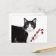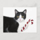 Gatinho preto e branco segura uma bengala doce listrada de Natal em espanto porque ele realmente queria foto de catnil cartão de Natal