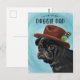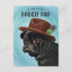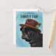 Cartão de Dia dos Pais ou aniversário com tema de cachorro fofo com ilustração pintada à mão de um filhote pug usando um chapéu fedora marrom. O texto no topo diz "você é o melhor papai cachorro".