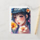 Mantendo contato com o cartão postal. Linda garota com olhos roxos e cabelo escuro cercado por narcisos amarelos. Bonito floral e anime com tema arte digital ai.
