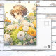 Cartão de aniversário personalizado. Flores em aquarela branca e amarela com uma linda menina de anime sentada dentro. Arte de IA.