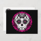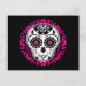 Minha versão de um crânio de açúcar super fofo em branco, rosa quente e preto com muitos sotaques elegantes em um fundo de coordenação. Mostrado aqui num cartão postal.