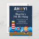 Este convite fofo e divertido apresenta uma menina marinheira macaco em um convés de madeira com uma gaivota e um caranguejo. Ao fundo, há um farol vermelho e branco, um passarinho fofo em um veleiro, ondas do mar e um céu noturno estrelado azul marinho. O texto combina fontes negrito e serifadas para um visual elegante e moderno. Isso é perfeito para uma festa de aniversário com tema marítimo.