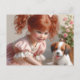 Esta imagem mostra uma criança e um filhote pequeno e fofo sentado no chão. O rosto da criança está feliz, e ela está vestindo um vestido rosa com detalhes de rendas brancas e tem cabelo vermelho amarrado com arcos brancos. O filhote, que tem pelo castanho, preto e branco, parece lúgubre com a língua visível. Ao fundo, há uma cesta mais vadia contendo flores e folhagem.