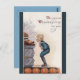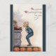 Este cartão-postal antigo apresenta uma ilustração de um menino fungando num peru cozido, e votos de Ação de Graças.