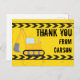 Cartão postal de agradecimento de veículo de construção personalizado legal para uma criança que ama veículos de construção amarelos em preto e amarelo. Design de escavadeira divertida para um menino que ama carros e caminhões. Personalize com o nome do seu filho sob a fita de advertência preta e amarela.