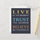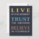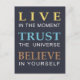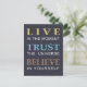 Um elegante e moderno design de tipografia com fundo azul escuro e texto amarelo, azul e marrom, com uma mensagem para lembrar de viver no momento e confiar que tudo vai ficar bem. Para cartões, postais, cartões de aviso, envelopes, etiquetas e anúncios.