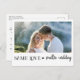 Diga a sua família e amigos que, devido às circunstâncias atuais, você está redimensionando seu casamento para uma cerimônia menor e íntima, com este cartão-postal moderno e elegante. Adicione uma de suas fotos horizontais favoritas à frente da carta, com a frase "Mesmo amor, casamento menor" em fontes pretas modernas decoradas com um pequeno coração negro. Na parte traseira do cartão postal, você pode adicionar seu endereço de devolução e personalizar sua mensagem com mais detalhes e seu endereço de casamento para mais atualizações.