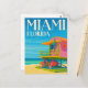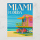 Capture the vibrant, sunny spirit of the Sunshine State with this stunning Miami Florida travel postcard! This captivating illustrated design features an iconic colorful lifeguard stand on a golden South Beach, set against the brilliant turquoise waters of the Atlantic Ocean and a clear blue sky. The stylized art beautifully captures the lively atmosphere and Art Deco charm of Miami.