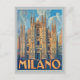 Volte no tempo com este cartão postal de viagens vintage celebrando o fascínio de Milão, Itália. A icônica Catedral de Milão (Duomo di Milano) é alta, a sua intrincada arquitetura gótica foi justaposta contra a vibração contemporânea da cidade. Capturar a essência da rica história de Milão e do talento cosmopolita.