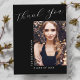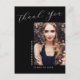Este cartão moderno elegante de 1 foto de graduação "Obrigado", apresenta elementos de design de texto moderno fundido com um elegante roteiro de caligrafia. A foto do seu graduado é exibida na frente do cartão, enquanto o verso do cartão oferece espaço de texto personalizado para uma mensagem de agradecimento ou pode ser deixado em branco se você desejar escrever sua mensagem à mão. Os fundos são pretos com texto branco ou facilmente personalizáveis para as cores de sua escolha.