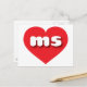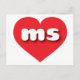 Este cartão-postal apresenta um coração vermelho vibrante contendo as letras minúsculas em negrito, branco, arredondadas, uma abreviação lúdica para o Mississippi, o estado magnólia. O reverso da placa é vazio, aguardando seu texto personalizado ou sentimentos escritos à mão.