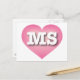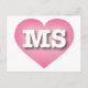 Este cartão-postal apresenta um coração calmo, legal e colecionado cor-de-rosa com um centro lavado em branco contendo as letras maiúsculas e em negrito MS, a abreviação oficial para Mississippi, o Estado Magnolia. O verso do cartão postal é vazio aguardando seus sentimentos manuscritos ou texto personalizado.