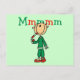 Um design de camiseta de Natal com uma figura de palitos, uma criança comendo uma cana doce e um texto vermelho e verde que diz "Mmmm".