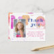 Obrigado moderno, bonitinho e feminino que você faz postal com uma foto, uma mensagem para sua família e amigos e um nome. O cartão-postal tem bolhas coloridas em cores púrpura e rosa e pequenas estrelas coloridas. Personalize este cartão com fotos com o nome do seu filho e a foto do seu filho - insira a sua foto no modelo. Você também pode alterar o obrigado que você envia se quiser.