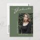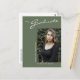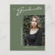 Este cartão-postal de anúncio de graduação elegante, mas simples, apresenta elementos design do texto moderno fundidos com um roteiro elegante de caligrafia. A foto do solteiro de formandos destaca a frente do cartão, enquanto a parte traseira do cartão oferece espaços de texto personalizados para informações sobre a formatura e a viagem futura. Escrevendo branco em verde na moda ou personalize facilmente o plano de fundo para uma cor de sua escolha. Para ver mais itens como este, visite minha loja aqui em "www.Zazzle.com/LakeViewCardCo". Obrigados