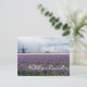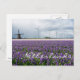 Cartão-postal de uma paisagem com moinho de vento tradicional e várias moinhos de vento modernos para gerar energia verde atrás de um campo com flor de hífen roxa na região de Bulb na Holanda e o texto: "Países Baixos".