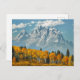 Esta foto mostra um pomar Aspen em cores de outono com montanhas cobertas de neve ao fundo, Grand Teton National Park.