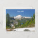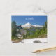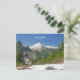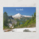 O pico coberto de neve do Monte Baker sobe para um céu azul claro em um dia de verão no noroeste do Pacífico. Abaixo da montanha, um pequeno lago alpino espia por trás de algumas árvores verdes que crescem perto da neve. Envie a alguém especial uma vista desta paisagem majestosa das Cascadas do Norte de Washington com este cartão-postal de fotografia da paisagem.