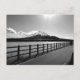 Cartão-postal preto e branco de neve capturou o Monte Fuji da margem do lago Yamanaka, um dos Cinco Lagos Fuji.