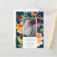 Esta foto floral, salvando a data, é perfeita para os casamentos outono. O tema do outono salve a data do cartão postal com lindas flores aquáticas e folhagem em bonito cores de outono, como ameixa, ouro amarelo, pêssego e verde-oliva, tudo contra um fundo azul escuro e sangrento. As flores de outono estão dispostas em um buquê que espia por trás de uma foto e detalhes do casamento. Adicione detalhes adicionais do casamento, incluindo o site do seu casamento, à parte traseira do cartão.