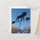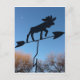Silhueta de weathervane Moose durante um pôr de sol azul de inverno com lua parcial no fundo e membros de árvore sem folhas...
