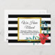 Você pode personalizar o texto preto com seu nome e novo endereço. O campo de texto personalizado diz "Nós nos movemos" acima do nome e endereço. O fundo tem faixas horizontais brancas e pretas. Uma flor vermelha está no canto inferior.