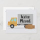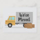 Nós nos mudamos. Cute mudou cartões postais de anúncio com um desenho de caminhão em movimento e seu próprio texto personalizado no verso. Anuncie sua mudança de endereço da sua nova casa para amigos e familiares.