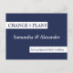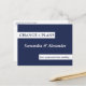 Avise aos seus convidados que adiou seu casamento com cartões postais azuis marinhos modernos e minimalistas com blocos de cores geométricas brancas, um se estendendo do canto superior esquerdo com as palavras "mudança de planos" e o outro do canto inferior direito com sua mensagem personalizada em marinho azul itálico. Os nomes dos casais estão no centro em texto branco. A parte traseira inclui um endereço de devolução impresso personalizado e uma mensagem personalizada mais longa no texto do marinho em um fundo branco. Personalize o texto na barra lateral. ©Claire E. Skinner, Todos Os Direitos Reservados.