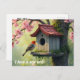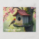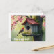 Um pássaro vermelho em uma casa de pássaros com telhado de azulejo colocado em uma cerejeira florida cria uma bela mudança de endereço postal que é perfeita para qualquer um que ama pássaros, flores e natureza.