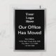 Frente: uma imagem de exibição está no topo. Você pode substituir a imagem pelo seu logotipo. "Nosso escritório se mudou" está no centro. Quatro linhas de texto branco para o seu novo endereço estão na parte inferior. A frente tem uma borda prateada faux (não de folha metálica). Traseiro: O verso é vazio.